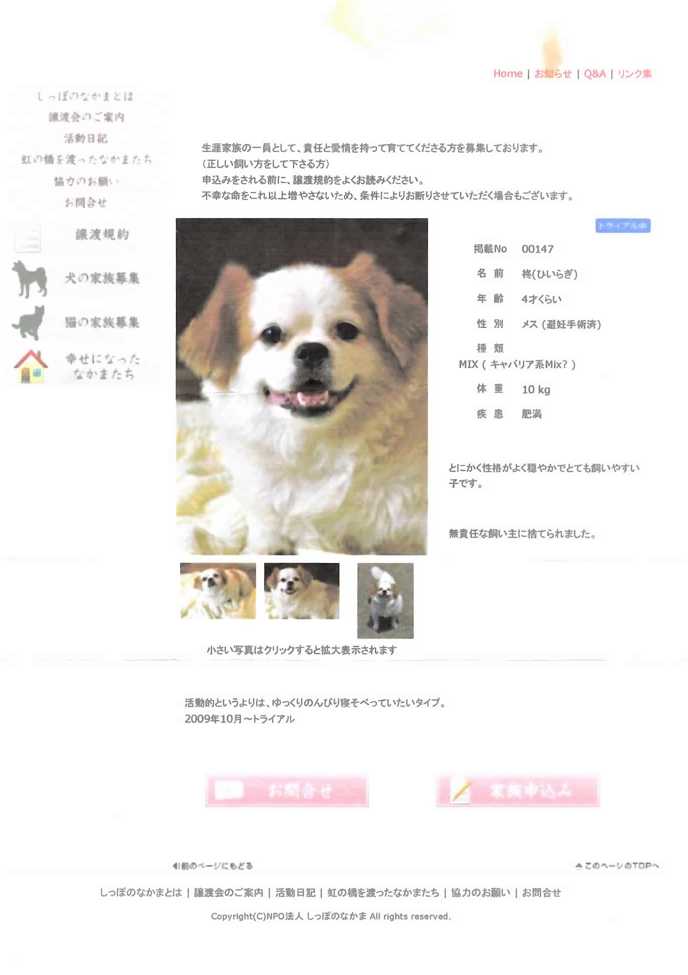 初代の里親犬が息を引きとって1月もたってないのに、次の子を探す神経は、きっとペットロスには程遠いでしょう。2代目も犬猫里親会のHPのご縁でした。名前はひいらぎ。推定年齢4歳のメスで、おデブな中型犬でした。犬種はペキニーズ系MIX。もう6年以上も前になります。