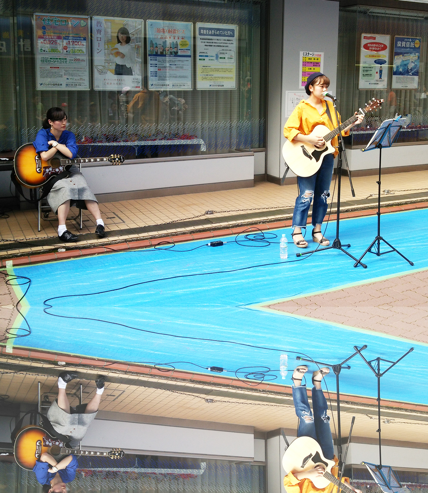 - さわやか信用金庫の前ではストリートパフォーマンスの実演中、photoshopで編集サービス付です